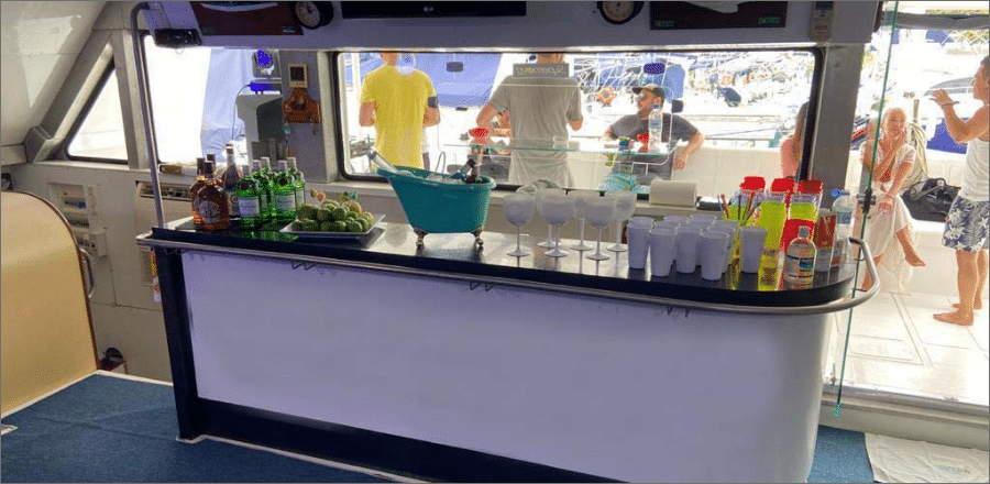 Alimentos e bebidas não estão inclusos na locação, mas você pode contratar nossos combos de bebidas ou KITs de alimentação, que incluem churrasco de frutos do mar, carnes premium e bebidas como cervejas, caipirinhas, champanhe e gim-tônica. Ao contratar esse serviço, você já embarca com tudo gelado e pronto, evitando filas e logística, especialmente no verão. O pedido deve ser feito com 48 horas de antecedência. Se preferir levar seus próprios itens, lembre-se do carvão e acendedor para churrasco; o marinheiro prepara e serve tudo, e grupos maiores podem solicitar um ajudante.
