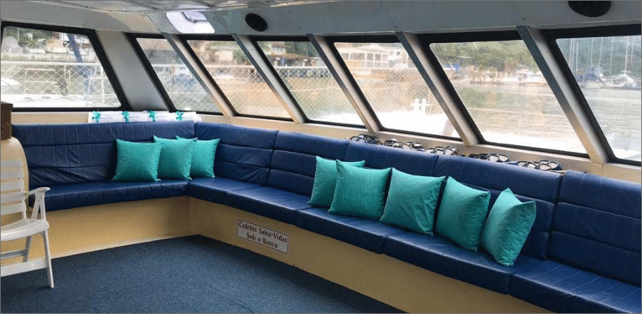 Alimentos e bebidas não estão inclusos na locação, mas você pode contratar nossos combos de bebidas ou KITs de alimentação, que incluem churrasco de frutos do mar, carnes premium e bebidas como cervejas, caipirinhas, champanhe e gim-tônica. Ao contratar esse serviço, você já embarca com tudo gelado e pronto, evitando filas e logística, especialmente no verão. O pedido deve ser feito com 48 horas de antecedência. Se preferir levar seus próprios itens, lembre-se do carvão e acendedor para churrasco; o marinheiro prepara e serve tudo, e grupos maiores podem solicitar um ajudante.