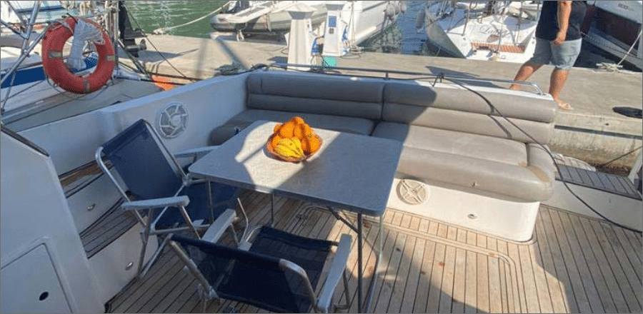 Alimentos e bebidas não estão inclusos na locação, mas você pode contratar nossos combos de bebidas ou KITs de alimentação, que incluem churrasco de frutos do mar, carnes premium e bebidas como cervejas, caipirinhas, champanhe e gim-tônica. Ao contratar esse serviço, você já embarca com tudo gelado e pronto, evitando filas e logística, especialmente no verão. O pedido deve ser feito com 48 horas de antecedência. Se preferir levar seus próprios itens, lembre-se do carvão e acendedor para churrasco; o marinheiro prepara e serve tudo, e grupos maiores podem solicitar um ajudante.