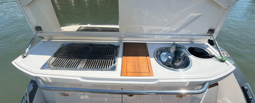 A bordo, você encontra enxoval completo, sistema de som com USB, Aux, CD e Bluetooth, snorkel, pés de pato, spaguetis, coletes salva-vidas, freezer, Sea-Doo e utensílios essenciais para o seu dia. A lancha também conta com solário, banheiro e churrasqueira, garantindo uma experiência premium do começo ao fim.