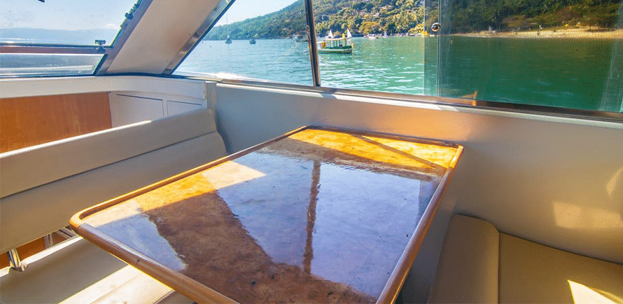 Alimentos e bebidas não estão inclusos na locação, mas você pode contratar nossos combos de bebidas ou KITs de alimentação, que incluem churrasco de frutos do mar, carnes premium e bebidas como cervejas, caipirinhas, champanhe e gim-tônica. Ao contratar esse serviço, você já embarca com tudo gelado e pronto, evitando filas e logística, especialmente no verão. O pedido deve ser feito com 48 horas de antecedência. Se preferir levar seus próprios itens, lembre-se do carvão e acendedor para churrasco; o marinheiro prepara e serve tudo, e grupos maiores podem solicitar um ajudante.