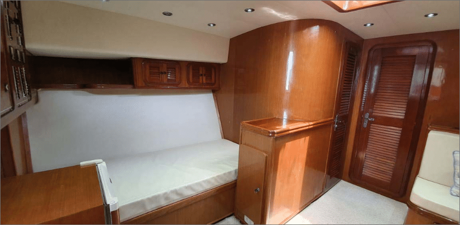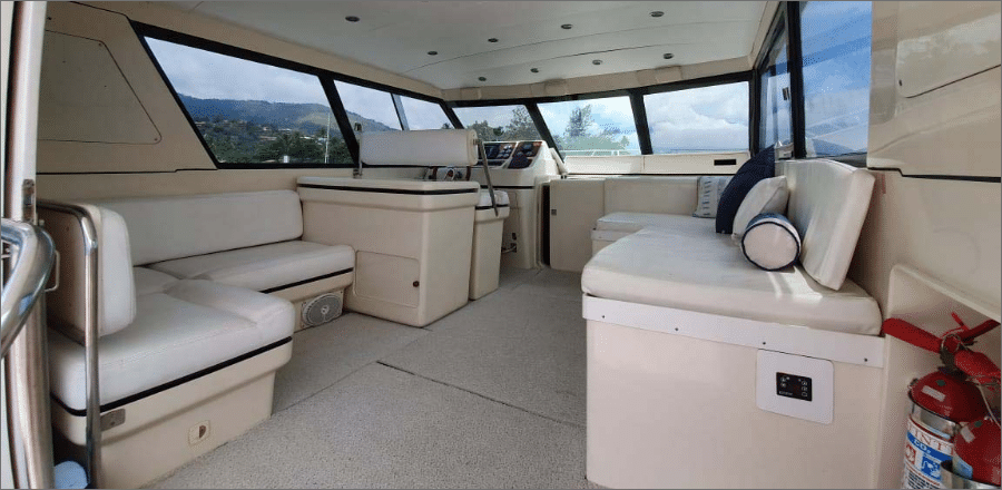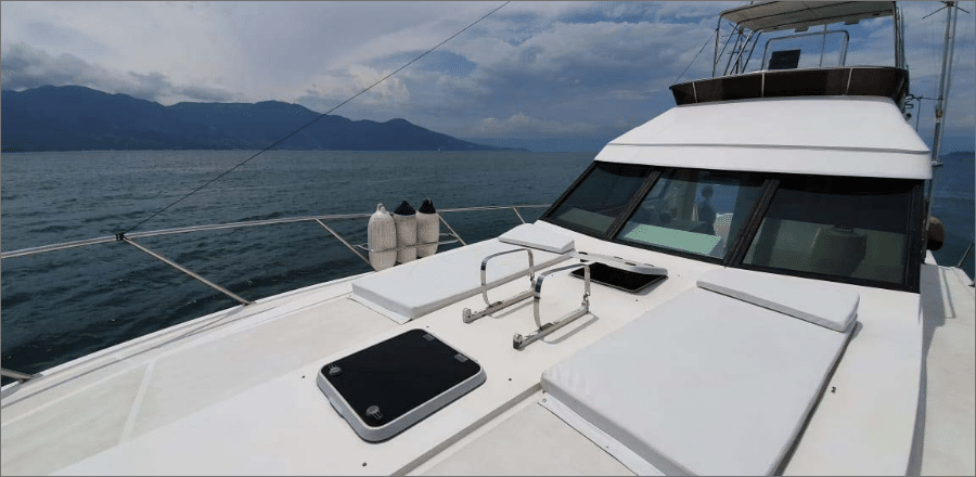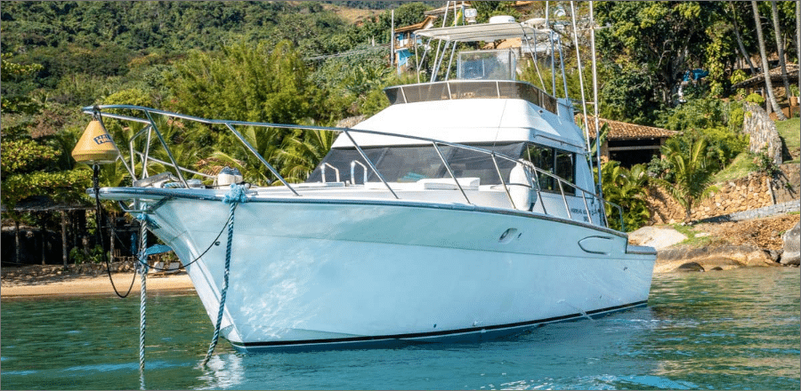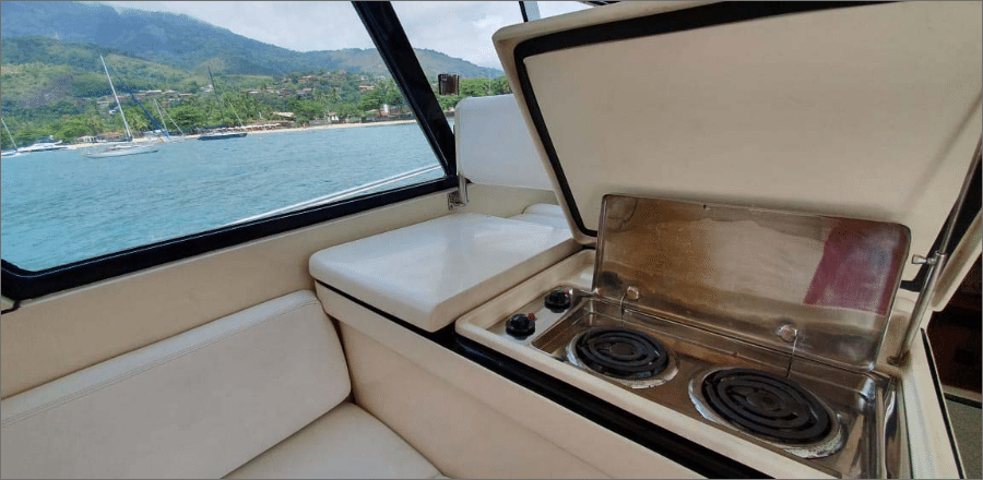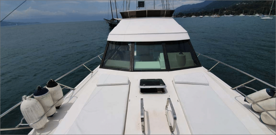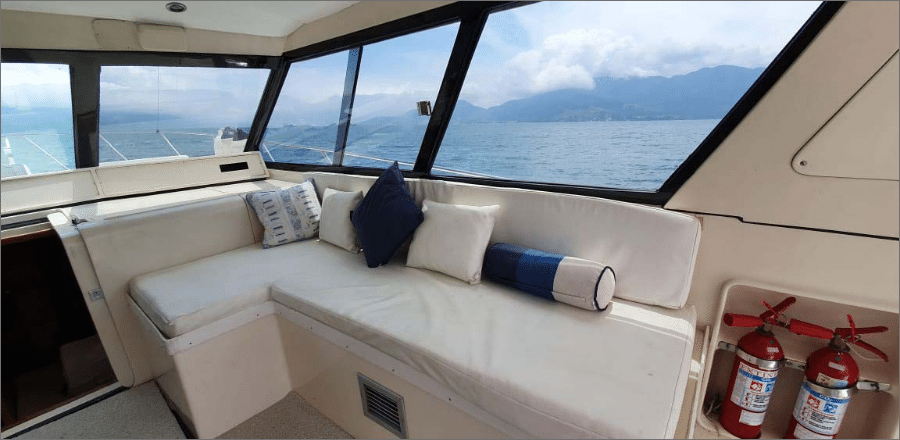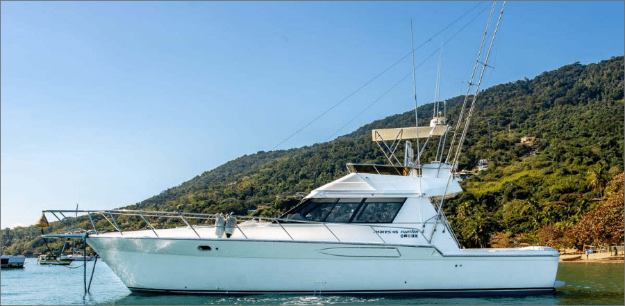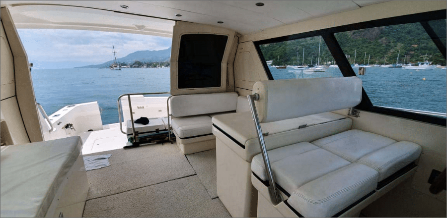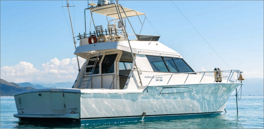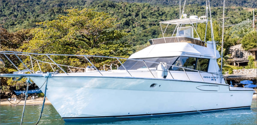 A lancha Mares 45, de 45 pés e capacidade para até 14 passageiros, é perfeita para um day charter em Ilhabela, unindo conforto e lazer em um só passeio. Ela oferece sala de estar, sala de jantar, sala de TV e fly-bridge, todas climatizadas com ar-condicionado nas cabines e salas. A área gourmet conta com churrasqueira elétrica ou a carvão, geladeira, micro-ondas e utensílios completos, enquanto o sistema de som com entradas USB, Aux, CD e Bluetooth garante a trilha sonora do seu dia no mar. Com coletes salva-vidas, spaguetis e paradas para mergulho, você aproveita um roteiro de até 8 horas com marinheiro incluso, escolhendo a data e o percurso ideal para reunir família e amigos e explorar os cenários mais incríveis de Ilhabela