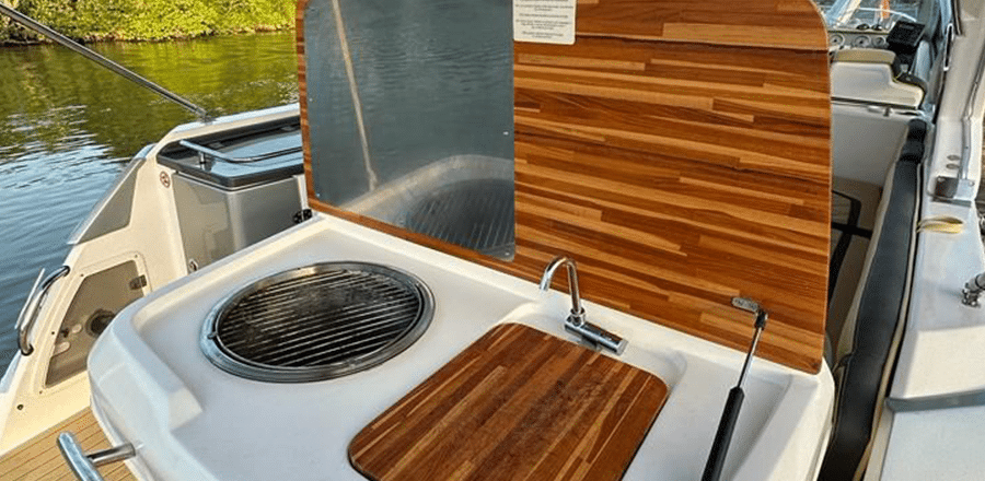 Alimentos e bebidas não estão inclusos na locação, mas você pode contratar nossos combos de bebidas ou KITs de alimentação, que incluem churrasco de frutos do mar, carnes premium e bebidas como cervejas, caipirinhas, champanhe e gim-tônica. Ao contratar esse serviço, você já embarca com tudo gelado e pronto, evitando filas e logística, especialmente no verão. O pedido deve ser feito com 48 horas de antecedência. Se preferir levar seus próprios itens, lembre-se do carvão e acendedor para churrasco; o marinheiro prepara e serve tudo, e grupos maiores podem solicitar um ajudante.